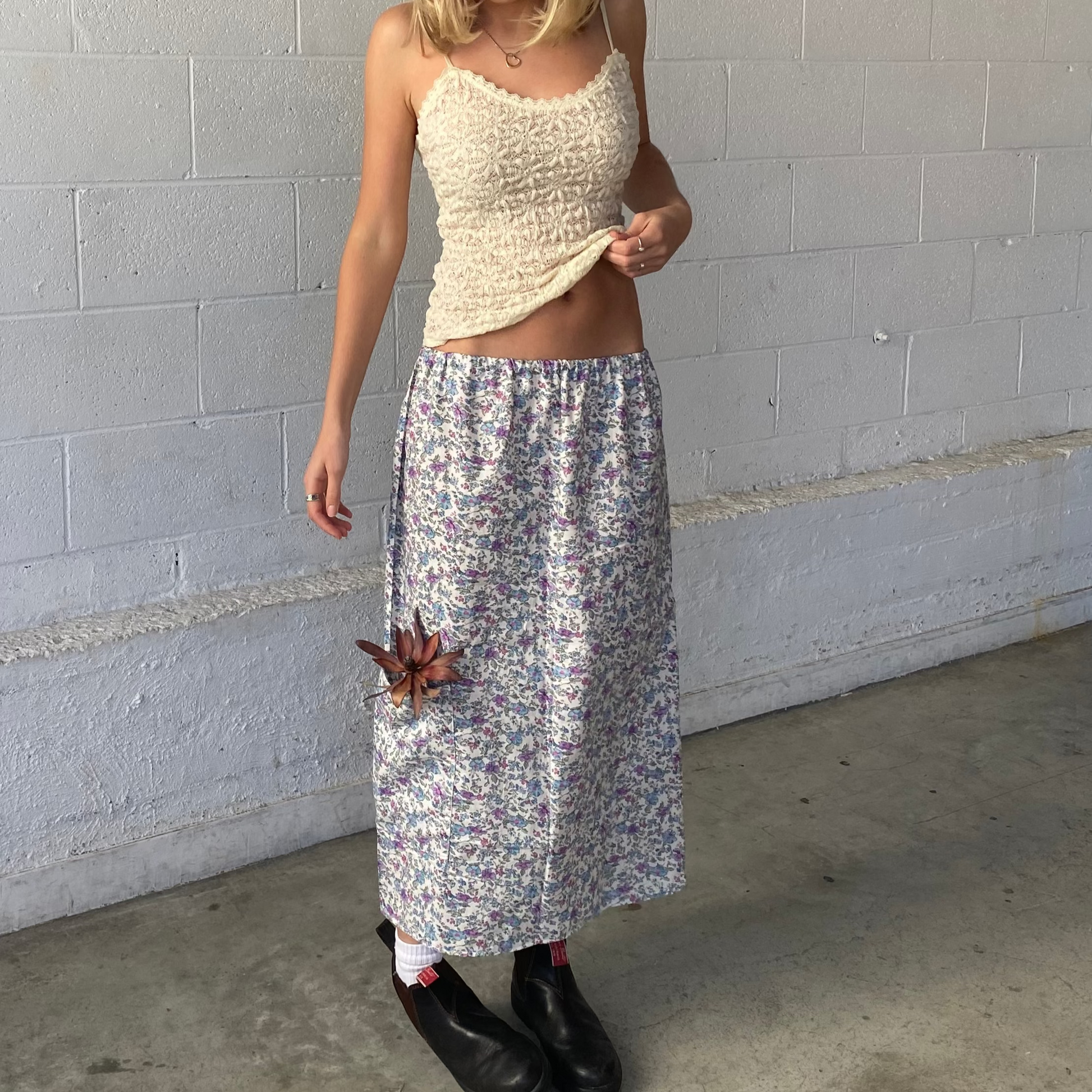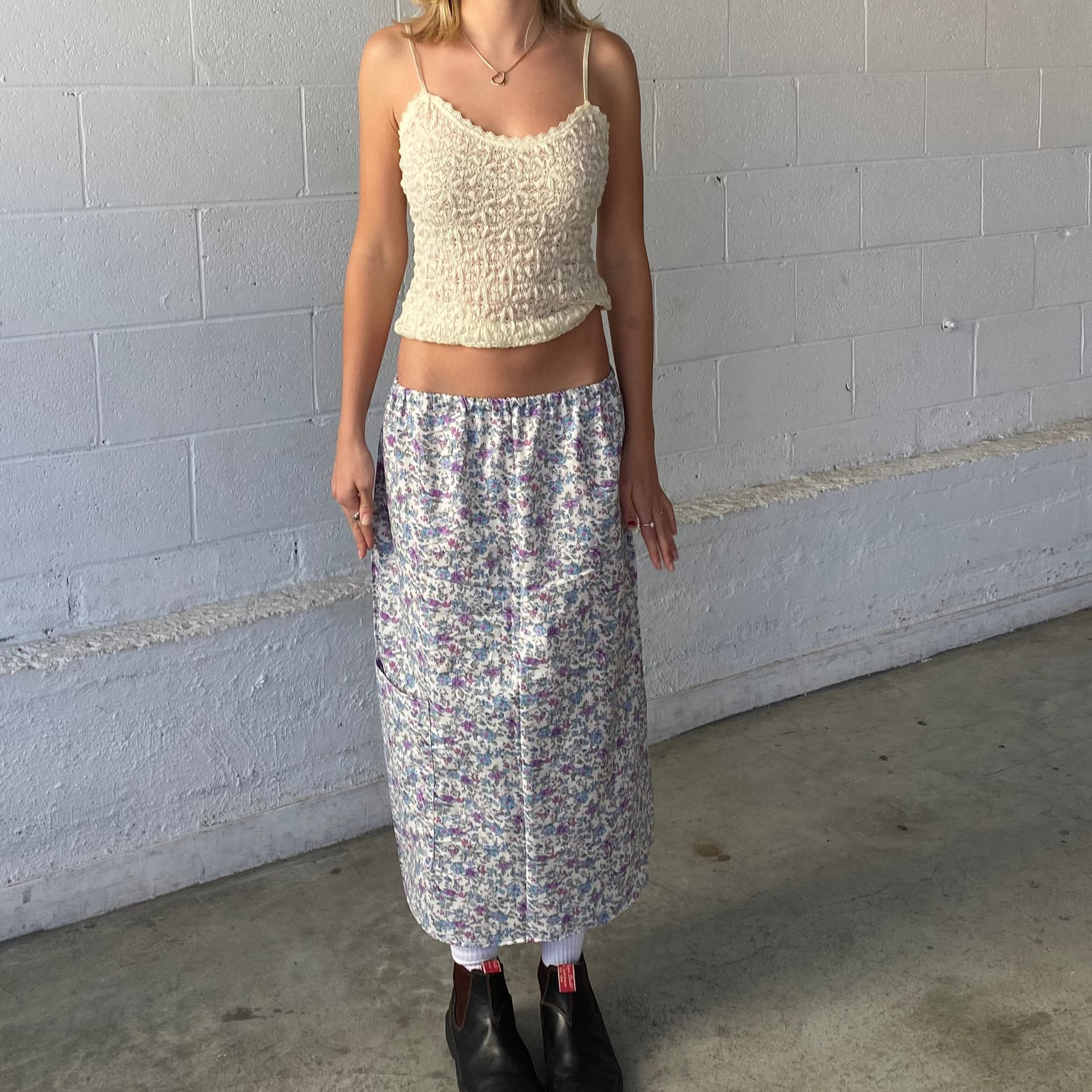 This floral skirt is lightweight and loose fitting, ideal for summer weather. It is designed to comfortably sit either high or low on the hips. The skirt features a large functional cargo pocket. Sizing on this skirt is flexible, ranging from an XS-M