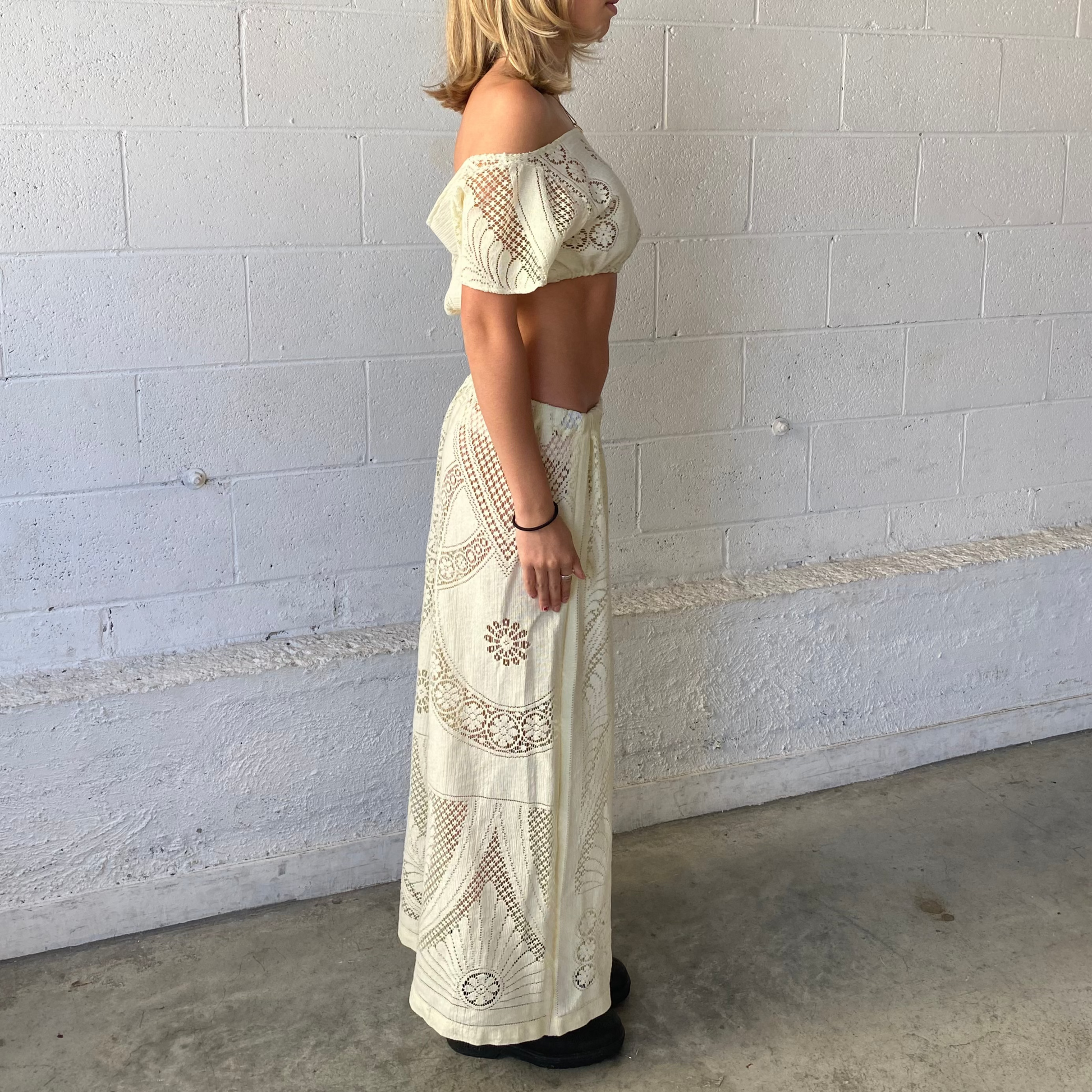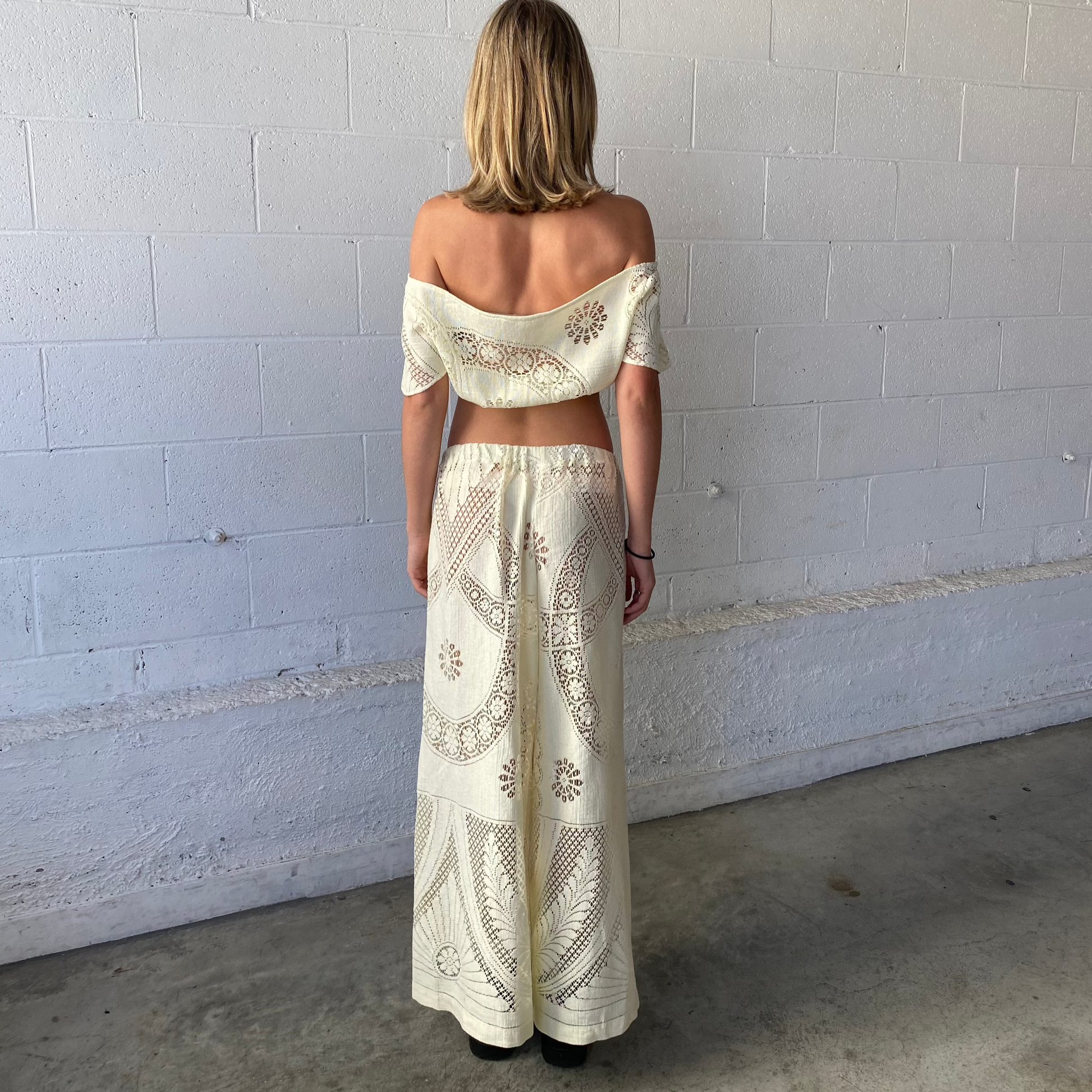 Loose fitting, wide leg pants. Soft and comfortable, perfect for summer evenings or throwing on over a bikini. Designed to sit low on the hips and be worn with matching top (piece 5). Beautiful butter yellow colour.