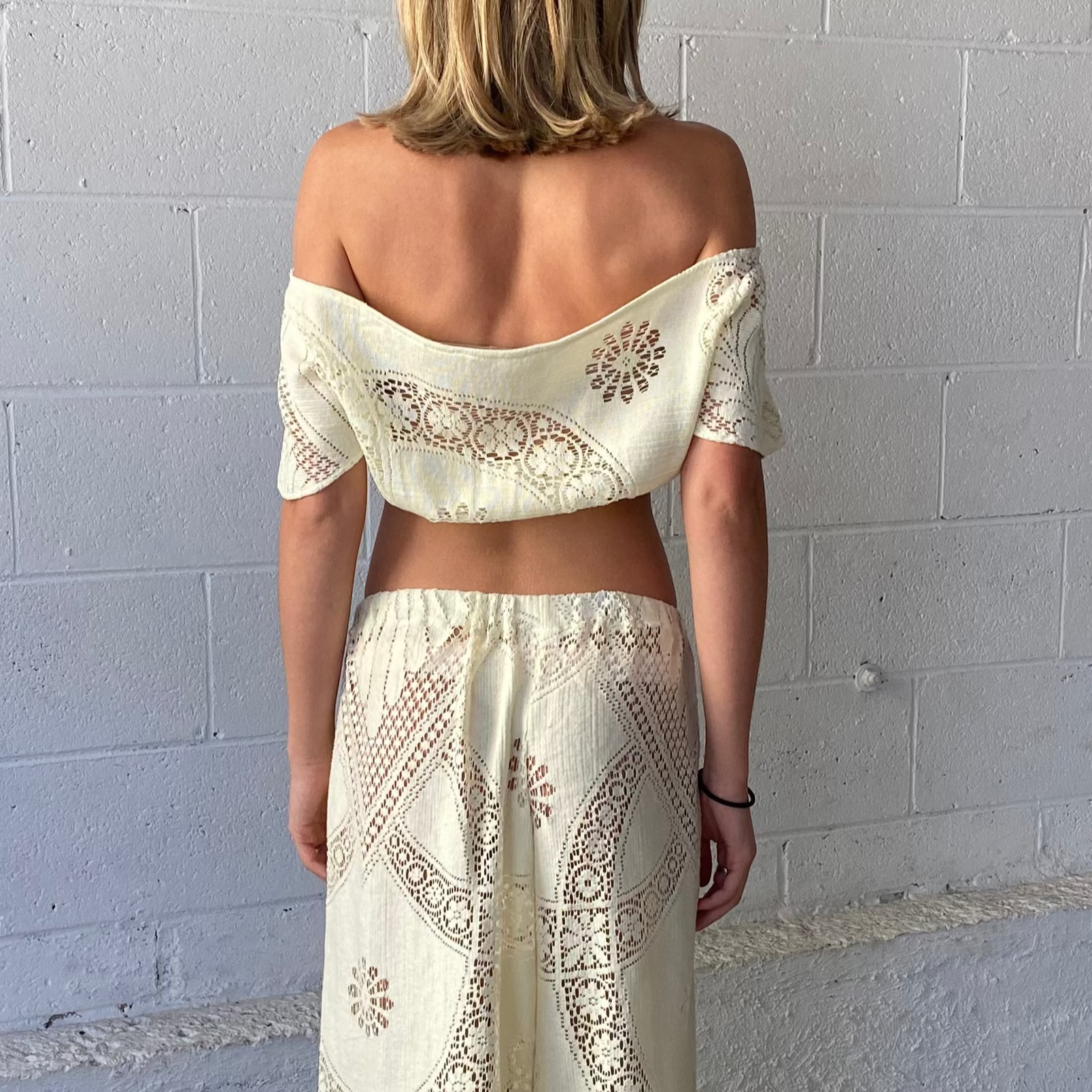 Butter yellow loose fitting crop top. The details in this fabric are so unique and beautiful. Top is soft and comfortable. Made to be worn with matching pants (piece 4).