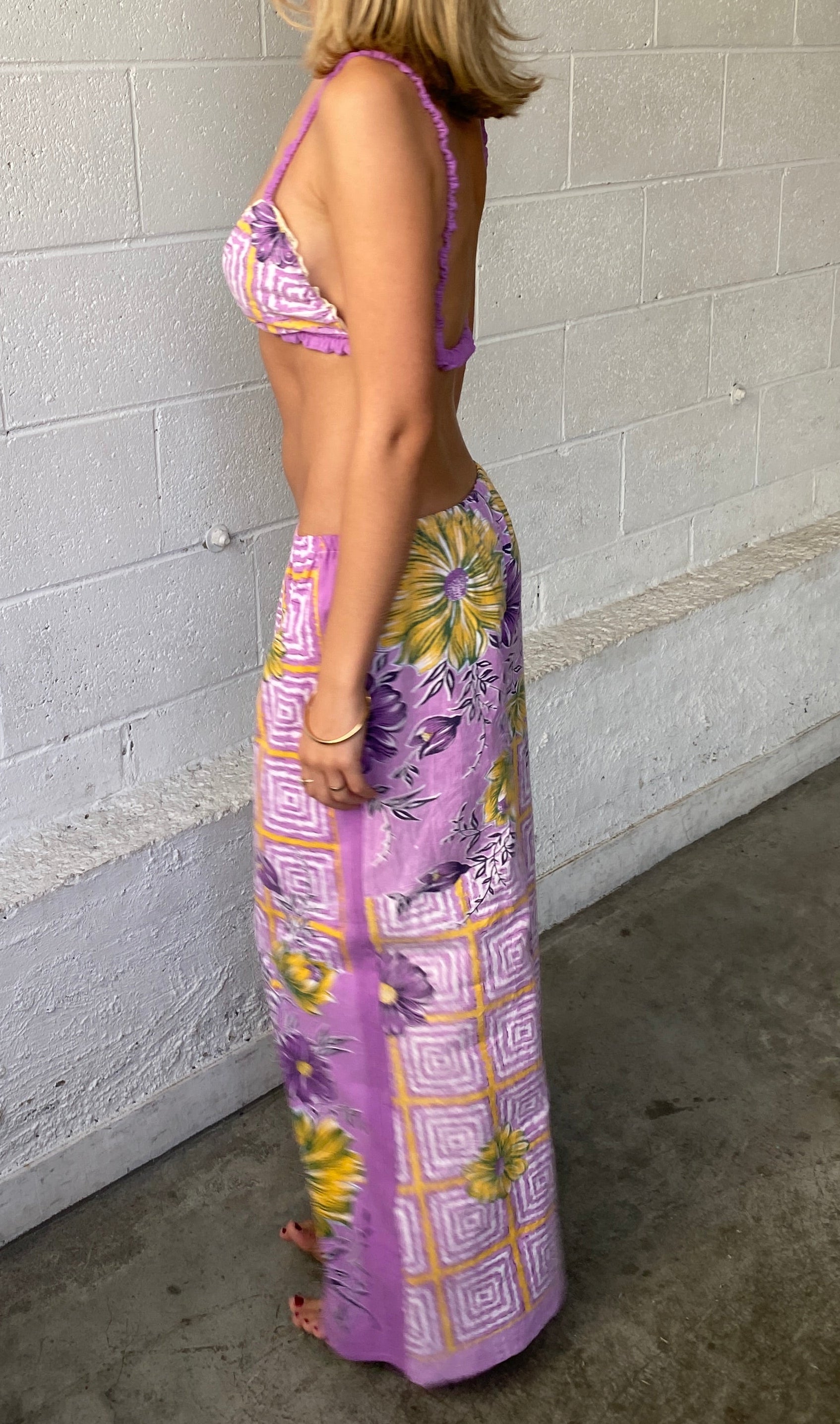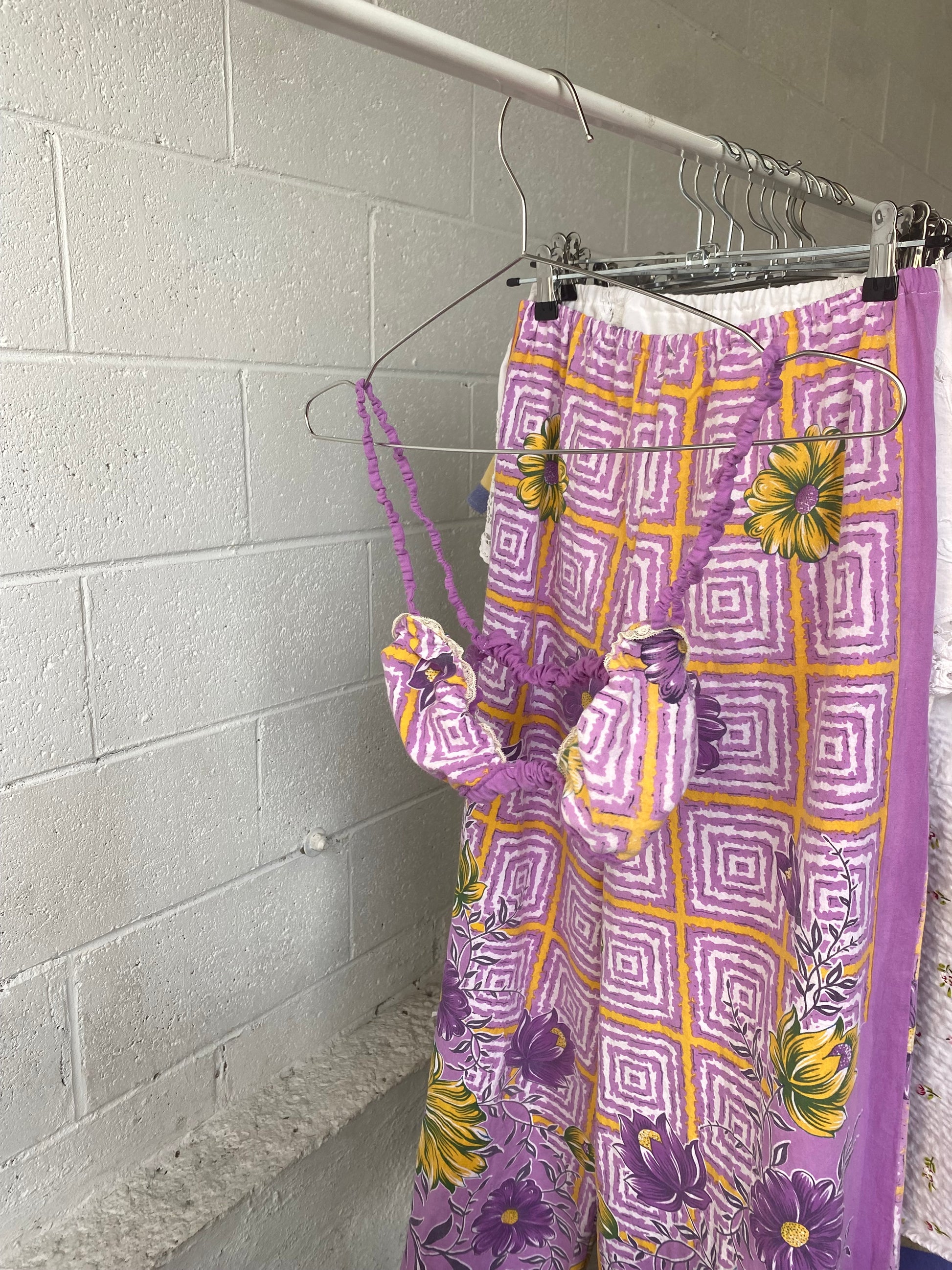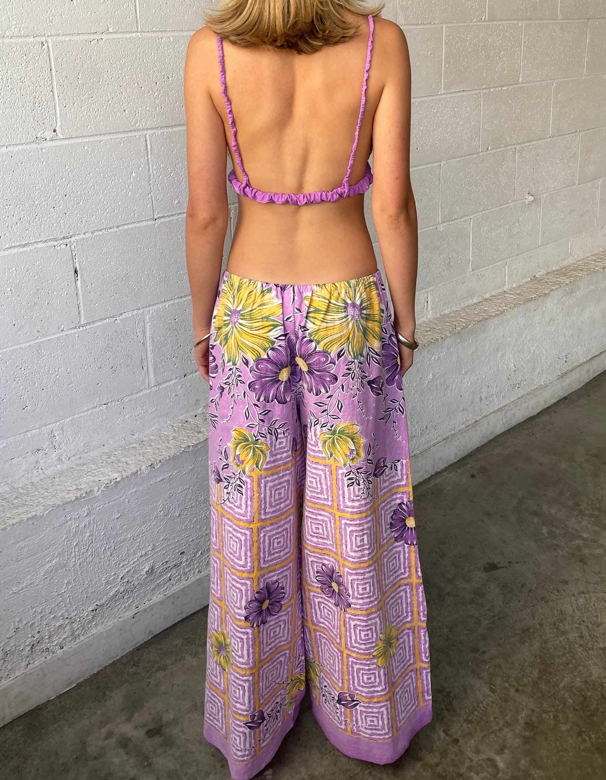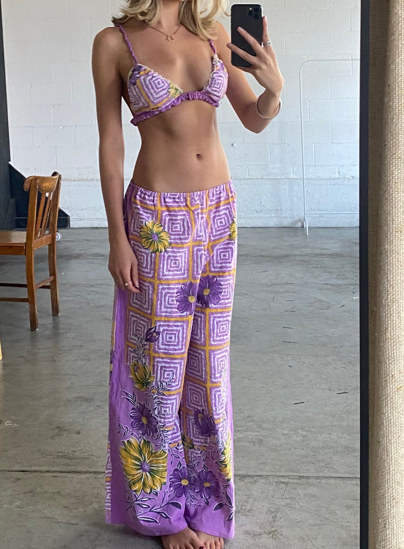 Matching vibrant, purple floral set. Features a bralette and wide leg pants. Bralette is double lined and includes elastic along to cups for support and comfort. Shown on a C cup and could fit a A-D comfortably. Includes vintage lace details around the edges. Pants are loose and wide leg. Super comfortable and lightweight.
