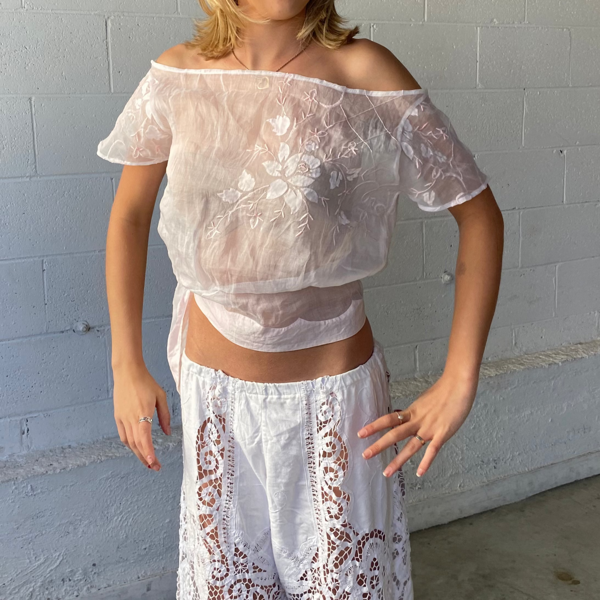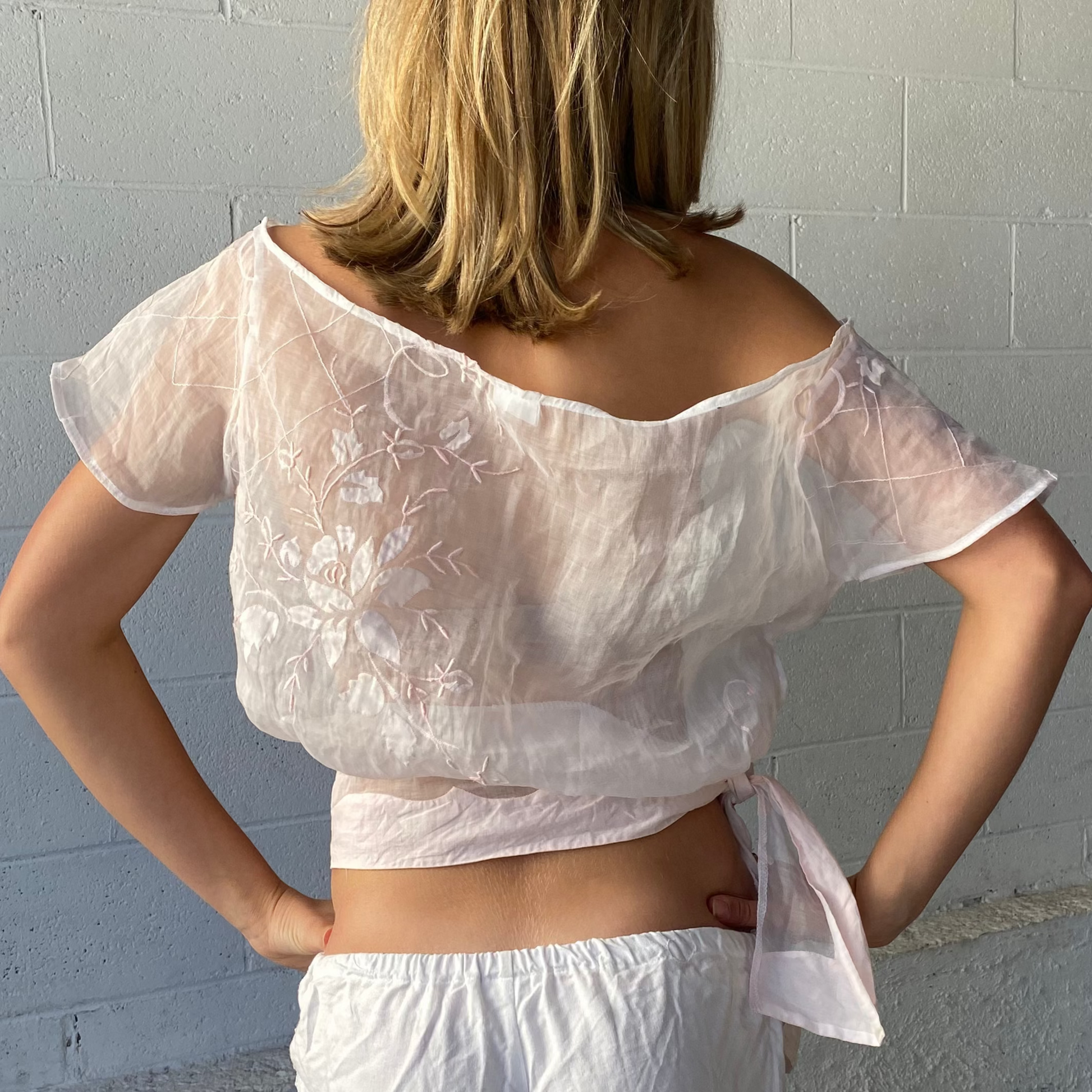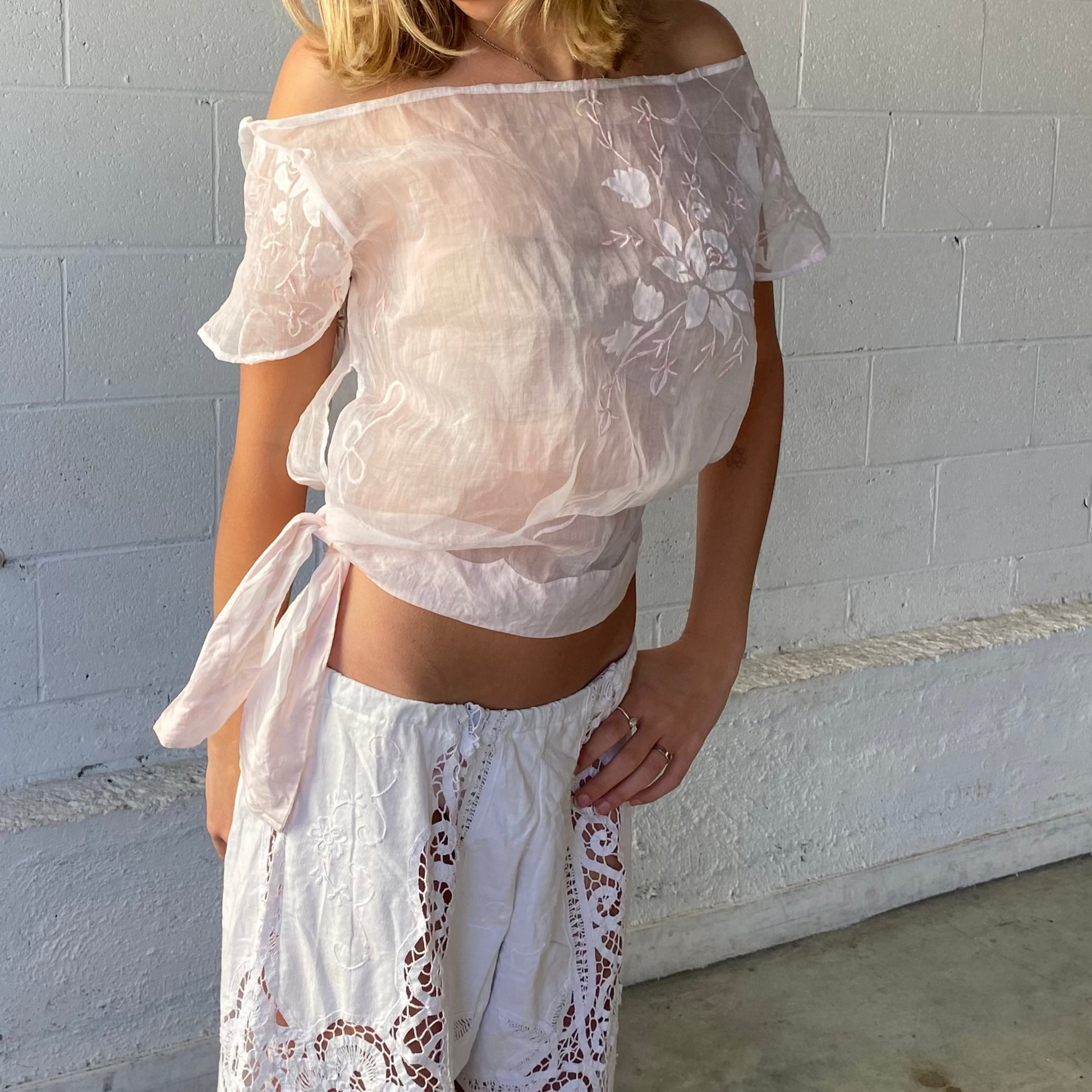 Beautiful light pink sheer fabric with embroidered florals. This top is made to sit off the shoulders and tie in at the waist.